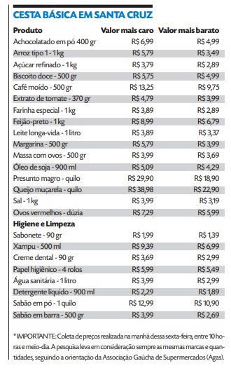 Em fevereiro a Gazeta do Sul deu início ao levantamento mensal da cesta básica em Santa Cruz do Sul. Seguindo a orientação da Associação Gaúcha de Supermercados (Agas), a pesquisa foca em marcas líderes de mercado, sempre pesquisadas nas mesmas quantidades e porções.
