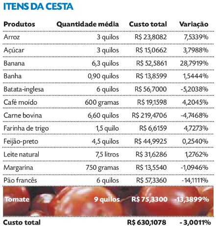 A cesta básica nacional ficou 3% mais barata em Santa Cruz do Sul. Entre o período de 6 de fevereiro e 5 de março, o valor total caiu de R$ 649,60 para R$ 630,10 – uma redução de R$ 19,50. Para a análise, o Centro de Estudos e Pesquisas Econômicas da Universidade de Santa Cruz do Sul (Unisc) verificou os preços de 13 produtos. Destes, cinco apresentaram redução: batata-inglesa, carne bovina, margarina, pão francês e tomate. Os demais – arroz, açúcar, banana, banha, café moído, farinha de trigo, feijão-preto e leite natural – registraram aumento.