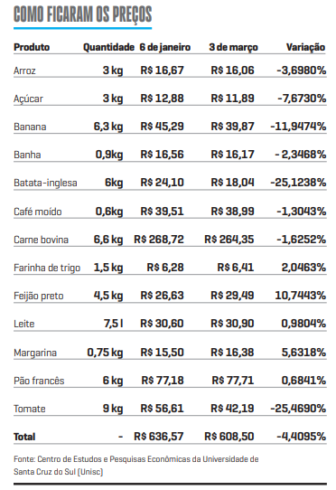 O custo dos alimentos básicos em Santa Cruz do Sul registrou uma queda sensível nos dois primeiros meses do ano. Entre 6 de janeiro e 3 de março, o valor do conjunto de 13 produtos essenciais recuou 4,4%, passando de R$ 636,57 para R$ 608,50. Na prática, o consumidor local está gastando R$ 28,07 a menos para abastecer a despensa, conforme levantamento divulgado nessa terça-feira, 3, pelo Centro de Estudos e Pesquisas Econômicas da Universidade de Santa Cruz do Sul (Unisc).
