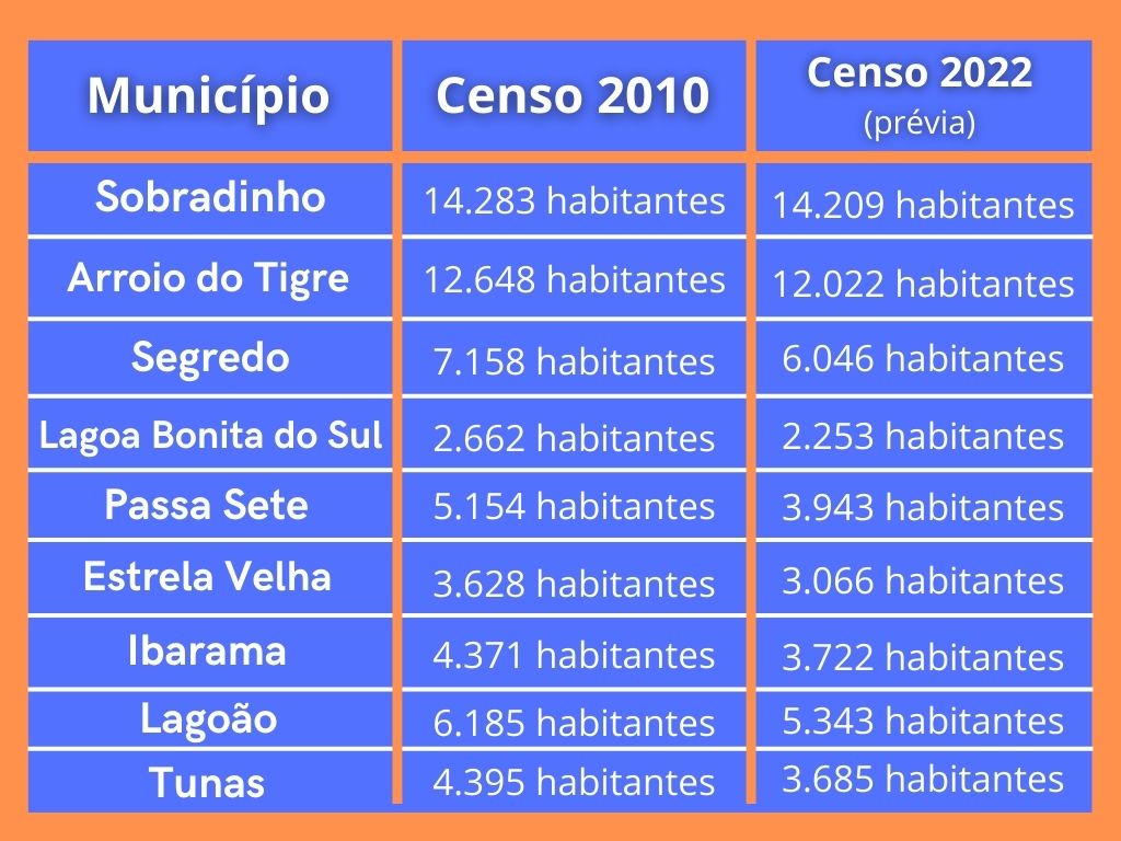 O total de habitantes na prévia do Censo 2022 na soma dos nove municípios (Sobradinho, Arroio do Tigre, Segredo, Lagoa Bonita do Sul, Passa Sete, Estrela Velha, Ibarama, Lagoão e Tunas) é de 54.289 pessoas.