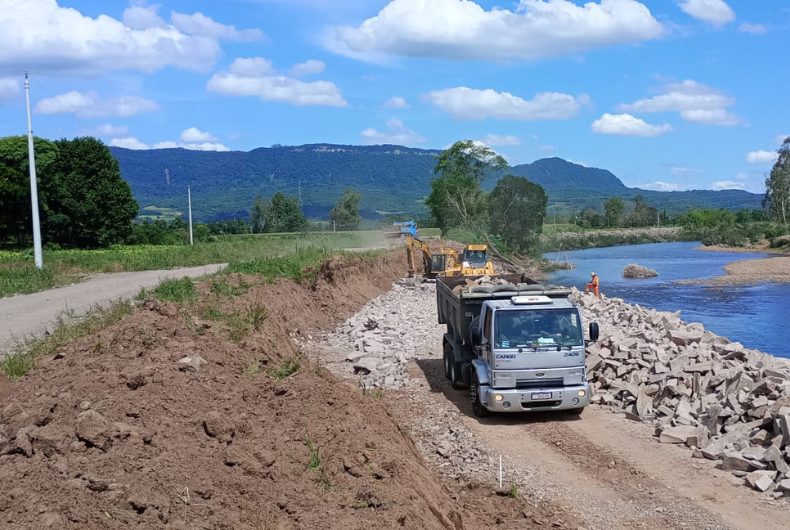 Na VRS-858 ocorre o enrocamento com pedra no local em que a água destruiu a estrada | Foto: Daer/Divulgação