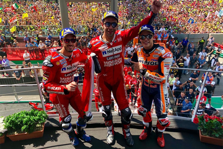 “Foi uma corrida fantástica. Inacreditável. O melhor lugar do mundo é aqui neste momento, junto com minha família e com meus amigos da Ducati. Agradeço também todo o apoio de Dovizioso”, disse Petrucci, que chegou com uma vantagem de 43 milésimos de segundo sobre Márquez, o segundo colocado. Dovizioso completou o pódio.