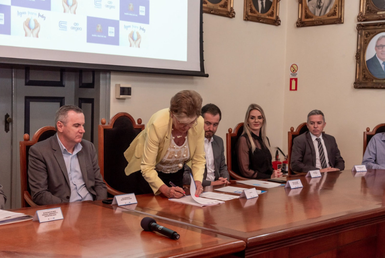 A prefeita de Santa Cruz do Sul, Helena Hermany, assinou na manhã dessa segunda-feira, 21, um termo aditivo de consolidação do contrato de programa entre o Município e a Corsan, empresa que passou a ser controlada pelo Grupo Aegea após a privatização. O texto, que ainda precisa passar pela Câmara de Vereadores, prevê o investimento de R$ 555 milhões até 2033. A cerimônia, realizada no Palacinho, teve a presença do diretor de Relações Institucionais da Aegea no Estado, Fabiano Dallazen; secretários municipais; vereadores; representantes da Agência Reguladora dos Serviços Públicos Delegados de Santa Cruz do Sul (Agerst); Ministério Público e imprensa.