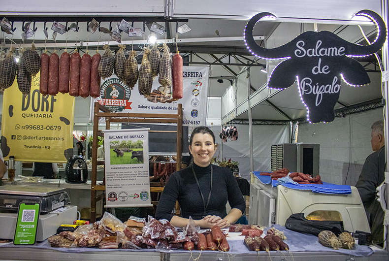 Um produto que promete agradar o paladar dos visitantes do espaço é o salame de búfalo produzido pela Agroindústria e Embutidos Ferreira, de Passo do Sobrado. Conforme Vanessa Cristine Ferreira Rutsatz, de 31 anos, o objetivo é fornecer uma opção saudável na feira. “O salame é rico em ômega 3, possui menos colesterol, gordura e é rico em proteína.”