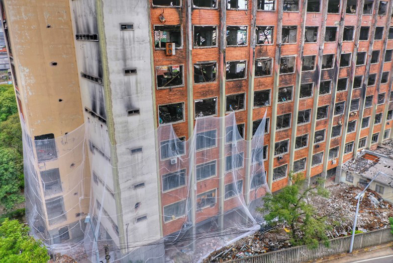 Operários da empresa demolidora passam tela através da abertura das janelas, envolvendo a estrutura até o quarto andar