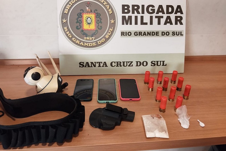 Dentro do imóvel, também foi encontrada uma porção de cocaína, que o homem relatou ser para uso próprio. Durante a ocorrência, a Brigada Militar ainda identificou dois pássaros silvestres presos em gaiolas: um azulão e um coleirinha. Os animais foram recolhidos. O homem foi preso e encaminhado para a Delegacia de Pronto Atendimento (DPPA) de Santa Cruz para registro do caso.