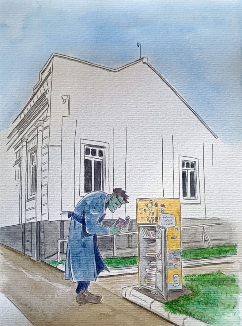 Essa nem a escritora inglesa Mary Shelley (1797-1851) poderia ter previsto: até a criatura criada pelo dr. Frankenstein tem sido vista pela região central de Santa Cruz. Ao menos, ela pode ser flagrada em uma obra de Arlei da série Desenha Santa Cruz. Na ocasião em que o artista a “captou”, ela estava espiando exemplar da geladeira de livros junto à Praça da Cultura José Paulo Rauber Filho, ao lado da Biblioteca Pública Municipal Elisa Gil Borowsky. Talvez estivesse mesmo conferindo se o romance no qual suas aventuras e desventuras são narradas, que tem como título o sobrenome do doutor, não estaria entre as opções disponíveis para leitores.