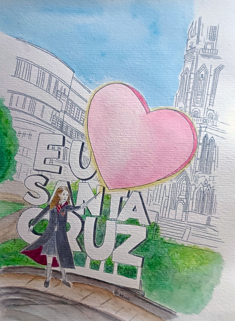 Milhares de turistas já devem ter tirado uma fotografia registrando-se com o display “Eu amo Santa Cruz” posicionado na Praça Getúlio Vargas, estrategicamente tendo a Catedral São João Batista na paisagem ao fundo. Pois Arlei flagrou mais uma ilustre visitante por lá: ninguém menos do que Hermione, a bruxinha de Harry Potter, da já clássica série criada pela britânica J. K. Rowling. E ela, como bem registrou em seu desenho, lançou um feitiço de transformação no coração da cidade, que parece capaz de inundar de amor a todos os habitantes.