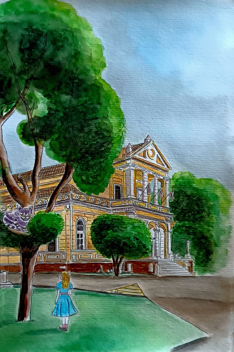 Com a Praça Getúlio Vargas contemplada, e sob os cuidados de Hermione, a parada seguinte de Arlei, descendo duas quadras pela Marechal Floriano, foi a Praça da Bandeira, que tem em seu centro o Palacinho, sede do poder Executivo Municipal. E quem ele flagrou por lá? Ninguém menos do que a Alice, que viajou do País das Maravilhas até Santa Cruz para bater um papinho com o gato de Cheshire, este acomodado sobre os galhos de uma das centenas de árvores que emolduram aquele ambiente urbano. Foi o gato que deve ter soprado a Alice que esta, sim, era uma Cidade das Maravilhas!