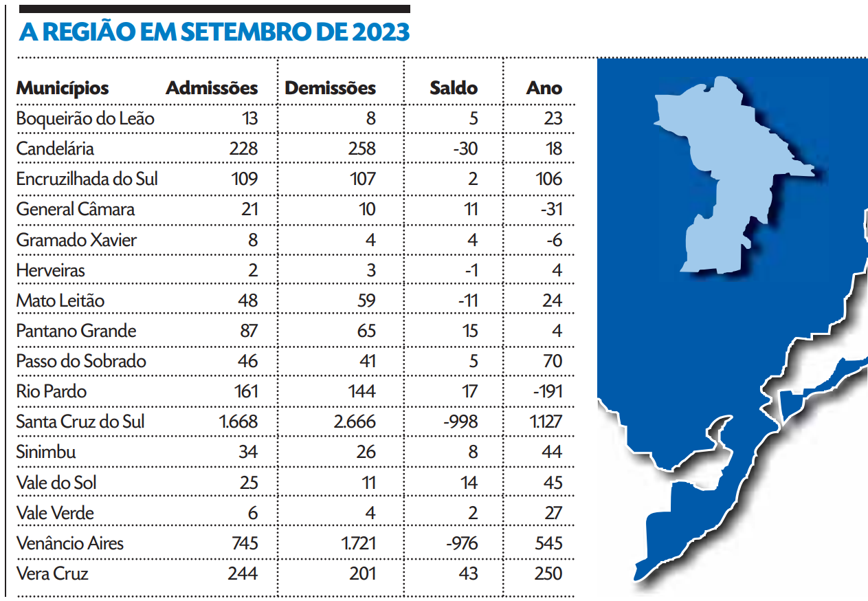 Santa Cruz do Sul teve, em números efetivos, o maior fechamento de vagas (998). Apesar de alto, serve de alento se comparado com o mesmo mês de 2022, quando foram fechadas 1.428 postos de trabalho. Ainda assim, o município figura entre os dez maiores geradores de emprego do Rio Grande do Sul em 2023, com 1.127 de saldo.