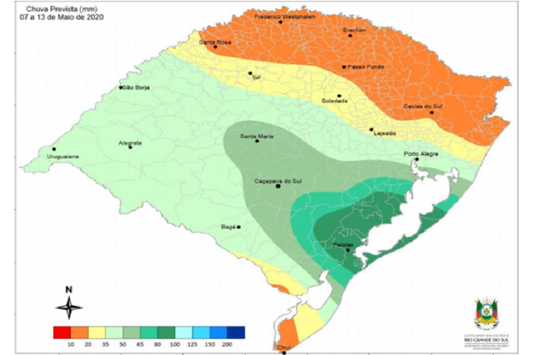 Boa parte do Rio Grande do Sul deverá receber chuva de forma expressiva nos próximos sete dias, de acordo com relatório elaborado pela Secretaria da Agricultura, Pecuária e Desenvolvimento Rural (Seapdr), pela Emater e pelo Irga.