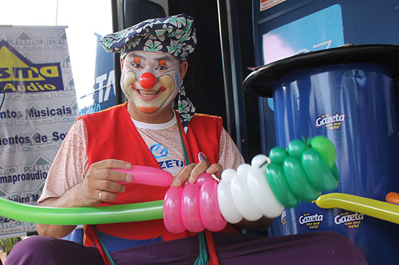 Com o rosto pintado e estampando sempre um sorriso, Biscoitão foi uma atração a parte na Fejão. No domingo, enquanto conversava com a reportagem da Gazeta em frente ao ônibus azulão, atraiu a atenção de curiosos com suas esculturas de balões. Muitos paravam para tirar fotos, principalmente crianças. “De início algumas crianças tem de chegar perto medo. Mas depois se soltam”, disse o palhaço, encantado com a recepção do público no parque.