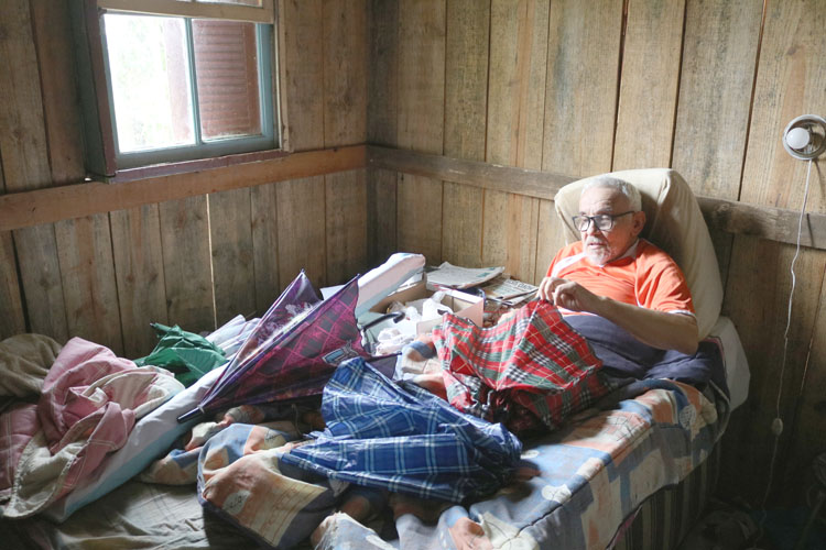 Jorge e a filha sobrevivem do Benefício da Prestação Continuada (BPC) do governo federal, que paga um salário mínimo (R$ 998,00) por mês a pessoas com mais de 65 anos ou que tenham alguma deficiência. Além desse valor, o homem trabalha há mais de 40 anos no conserto de guarda-chuvas, sombrinhas e guarda-sóis. Outrora fazendo o conserto de 50 sombrinhas por dia, hoje, devido à condição, faz o que pode trabalhando na própria cama. “Eu ia à Porto Alegre e comprava barato as sombrinhas quebradas. Trazia de ônibus para Santa Cruz, consertava e revendia”, explica Jorge, relembrando com orgulho a época ativa.