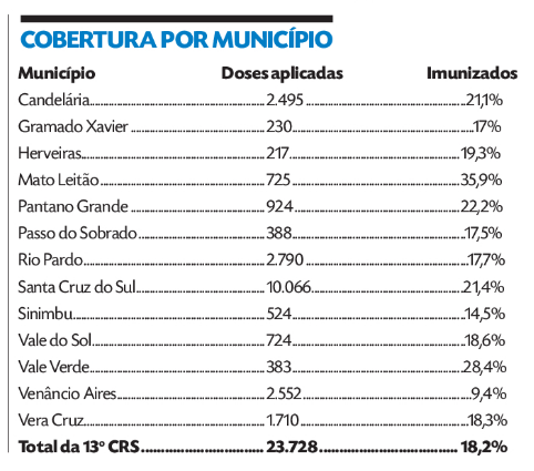 Até o momento, 10.066 doses contra a gripe foram aplicadas no município. A cobertura é considerada baixa na avaliação do coordenador do setor de Imunizações da Secretaria Municipal de Saúde, enfermeiro Roger Peres. “No ano passado a campanha iniciou mais tarde, então tínhamos menos vacinados. Porém, transcorrido o mesmo tempo de campanha, o número era maior”, observa. A expectativa em Santa Cruz é vacinar 59.415 pessoas durante a campanha, que vai até o dia 31 de maio.
