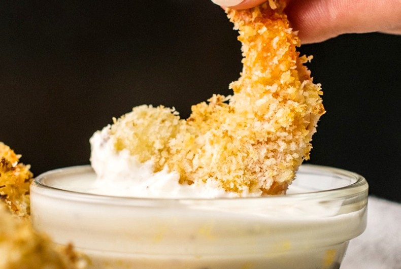 Preparo: misture numa tigela ou prato raso a farinha de rosca, o sal e a pimenta. Em uma segunda tigela, adicione as claras em neve batidas até formar e bata até formar bolhas. Em uma terceira tigela rasa, adicione o coco. Passe um camarão de cada vez, primeiro na mistura de farinha de rosca, mergulhe-os nas claras e cubra com o coco. Pressione bem o coco sobre o camarão para grudar o máximo possível. Adicione um pouco de óleo em uma frigideira e frite os camarões aos poucos, em óleo bem quente. Enquanto o camarão frita, prepare o molho agridoce combinando todos os ingredientes em um pote pequeno, misturando bem. Coloque na geladeira até a hora de usar. Não querendo usar fritura, pode-se colocar os camarões em uma assadeira e levar ao forno pré-aquecido a 220 graus por cerca de oito a dez minutos cada lado. Sirva acompanhado do molhinho agridoce e do espumante brut rosé bem gelado!