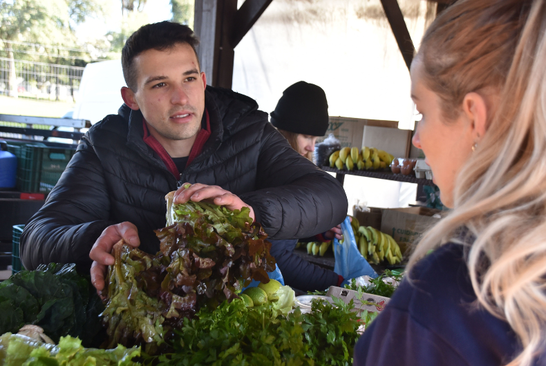 O jovem Diego Fritzen, de 24 anos, morador de Linha João Alves, começou a atuar na feira em 2021. Dando continuidade às atividades já desenvolvidas pela família, desde então ele é um dos 13 feirantes com banca nos fundos do Parque da Oktoberfest. Nas manhãs das quartas-feiras e dos sábados, já está no local a partir das 5 horas, para organizar a banca. Mas o trabalho começa antes, por volta das 3h30, quando levanta para carregar os produtos no veículo.