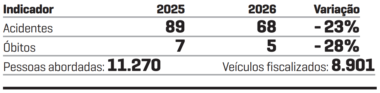 No total, os agentes fiscalizaram 11.270 pessoas e 8.901 veículos. O número de acidentes gerais também recuou, passando de 89 para 68 registros – uma diminuição de 23%.