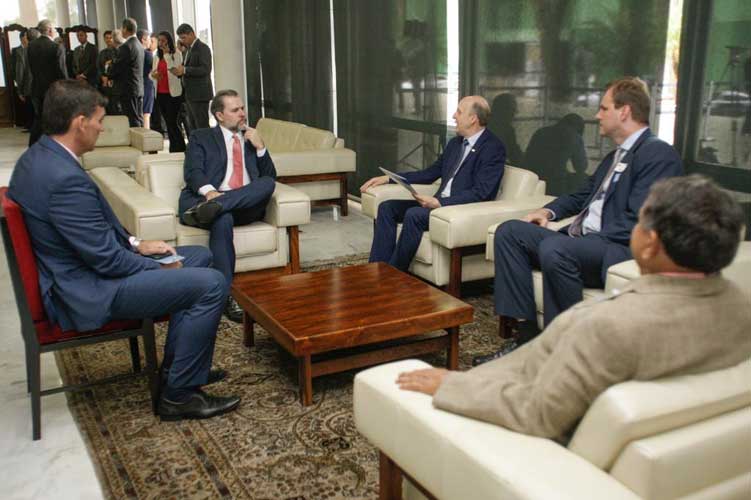 Presidente da CNM, Glademir Aroldi, e o consultor jurídico da confederação, Ricardo Hermany, conversam com Dias Toffoli sobre a pauta, junto a outros líderes