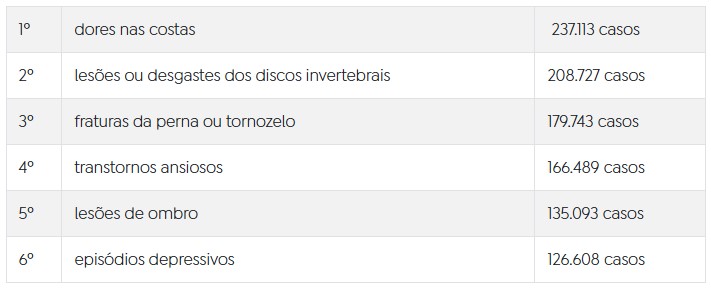 No caso das mulheres, em segundo lugar, aparecem os transtornos ansiosos (118.517), seguidos pelas lesões ou desgastes dos discos intervertebrais (98.305). Já no caso dos homens, em segundo fica a dorsalgia (115.527) e, em terceiro lugar, também as lesões ou desgastes dos discos intervertebrais (110.422), como as hérnias.