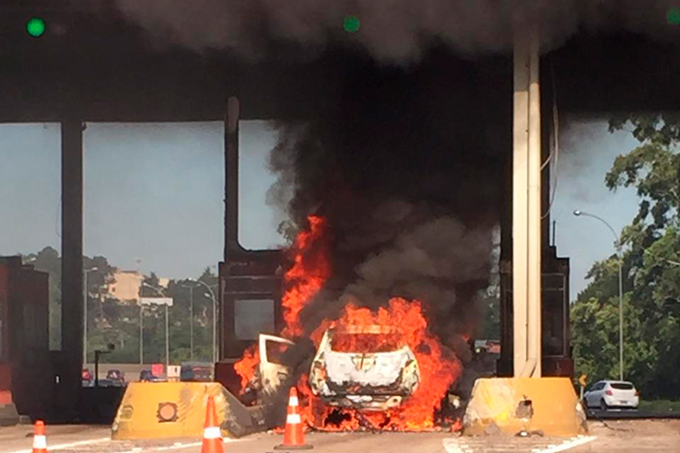 Dois carros pegaram fogo após uma colisão na praça de pedágio de Gravataí, no fim da tarde desta segunda-feira, 10. De acordo com a Polícia Rodoviária Federal (PRF), o acidente aconteceu por volta das 17h20, no sentido litoral – Capital. O condutor de um táxi, modelo Spin, colidiu na traseira de um Civic. Logo após a batida, houve o incêndio.