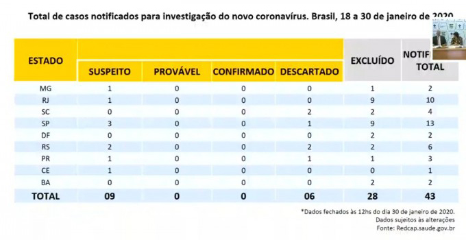 No Brasil, são nove casos suspeitos em investigação. Outros 33 já foram descartados ou excluídos. Desde o final de dezembro, mais de 7,7 mil casos já foram registrados na China, com 170 óbitos entre eles. Fora da China, foram confirmados 82 casos em 18 países. A Organização Mundial de Saúde passou, nesta quinta-feira, 30, a considerar a situação como uma emergência de saúde pública de importância global.