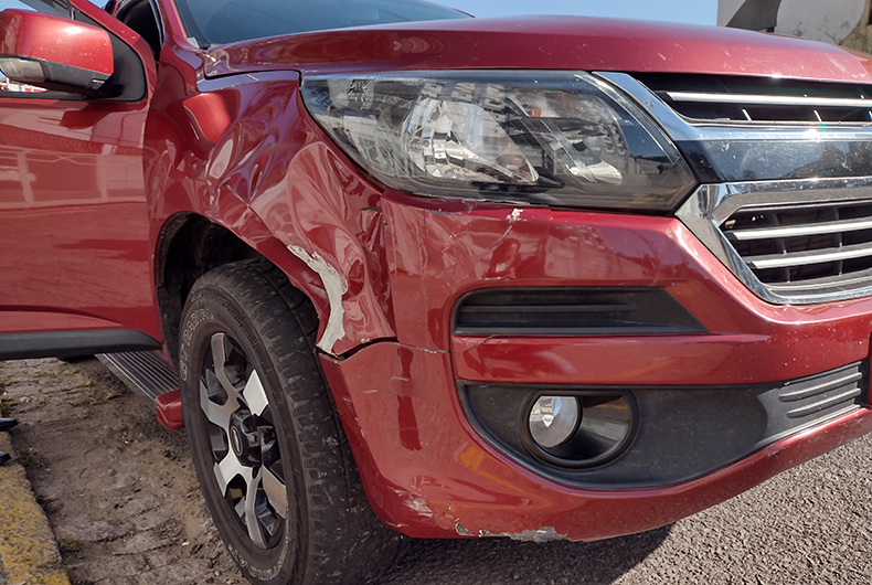 Danos na caminhonete do lado direito, na parte dianteira, onde moto colidiu
