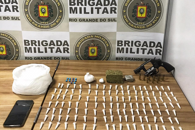 Ao proceder a verificação, a BM deteve um homem de 22 anos e localizou revólver calibre 38, seis munições do mesmo calibre, três munições de calibre 32, 10 comprimidos de ecstasy, 173 gramas de maconha, 130 pinos de cocaína, pesando 102 gramas, dois invólucros de cocaína, pesando 56 gramas, 600 pinos para comercialização do entorpecente e um celular. O jovem e o material foram encaminhados para registro na delegacia.