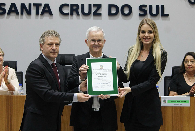 O quarto bispo da Diocese de Santa Cruz do Sul foi homenageado pela Câmara de Vereadores na noite de segunda-feira com a entrega do título de Cidadão Santa-cruzense. Dom Aloísio Alberto Dilli, nascido no dia 21 de junho de 1948 em Boa Vista, no município de Poço das Antas, no Vale do Caí, assumiu o posto em Santa Cruz em 2016. Agora, após completados 75 anos de idade, ele encaminha sua carta de renúncia ao Papa Francisco.