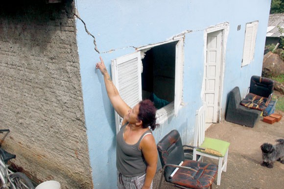 Toda vez que chove a rotina na casa da santa-cruzense Rosimere Braga, 38 anos, vira um verdadeiro transtorno. Além de precisar tapar as dezenas de goteiras que se formam pelo teto, nem dormir no próprio quarto ela consegue. Em razão da água que atinge o espaço, tem de dividir a cama de solteiro com a filha mais nova, Flávia, ou então leva o colchão para a sala, que nem sempre fica imune ao pinga-pinga. Não bastasse isso, ainda convive com expressivas rachaduras na residência e teme por uma parede precária na cozinha.