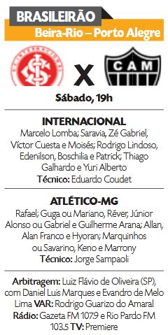 Depois de sofrer a primeira derrota para o Botafogo por 2 a 1, na quarta-feira passada, no Rio de Janeiro, e perder os 100% de aproveitamento no Campeonato Brasileiro, o Atlético-MG tenta se reabilitar diante do Internacional. O Galo aparece no terceiro posto, atrás do rival gaúcho por ter saldo de gols inferior. Existe a expectativa para a estreia de Eduardo Sasha logo contra seu ex-time, que o revelou para o futebol e que defendeu profissionalmente por cinco temporadas.