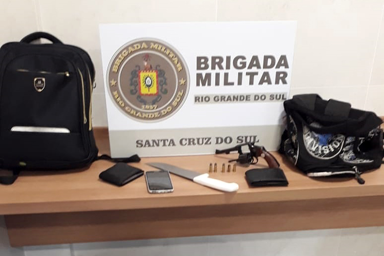 Os policiais fizeram buscas e encontraram os suspeitos. Um deles, de 30 anos, jogou no chão um revólver de calibre 32. Ele e o outro homem, de 23 anos, assumiram a autoria do assalto e indicaram o local onde haviam deixado o material roubado. Os objetos foram localizados pela BM em um matagal.
