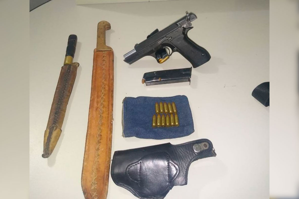 No veículo estavam os homens, de 23 e 33 anos, que não tiveram os nomes divulgados pela BM. Durante busca no carro, os policiais encontraram uma pistola calibre 9 milímetros, de origem israelense, municiada, além de dois carregadores, contendo 45 munições intactas, um coldre e dois facões. A dupla foi presa e levada à Delegacia de Polícia para registro do caso.