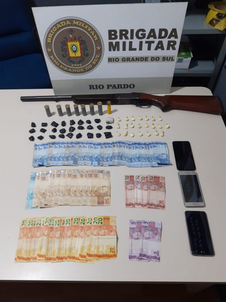 Os homens até tentaram fugir após verem a guarnição, mas foram alcançados e abordados. Com eles foram apreendidas 22 poções de cocaína, 27 porções de maconha, uma espingarda calibre 12 municiada e mais seis cartuchos – um deflagrado, uma munição calibre 20 deflagrada, R$ 1.282,00, três celulares e seis alto-falantes de 12 polegadas Spider. Os presos foram conduzidos para a Delegacia de Polícia para o registro da ocorrência.