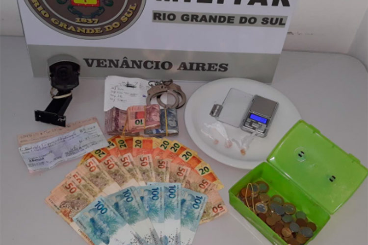 Na apreensão, a BM recolheu 61,3 gramas de maconha, 3,7 grama de crack, R$ 2.254,00 em cédulas, R$ 142,85 em moedas, folhas de cheque de R$ 100,00 e R$ 50,00, uma balança de precisão e três folhas com anotações.