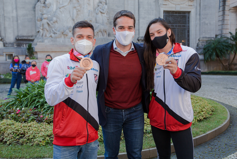 “Parabéns! Estou muito feliz e muito contente de receber vocês aqui. Muito obrigado por levarem o nome do nosso Estado com destaque a Tóquio”, disse o governador aos judocas. “Saibam que, quando vocês sobem ao pódio, sobe um monte de gente com vocês, pessoas que ajudam e as que torcem, ou seja, subimos todos nós. Parabéns, essa medalha é merecimento pelo esforço de vocês. Saibam que são exemplo e servem de inspiração para muita gente, especialmente jovens que ganham motivação a partir de vocês para praticar esportes e, quem sabe, também chegar à Olimpíada um dia.”