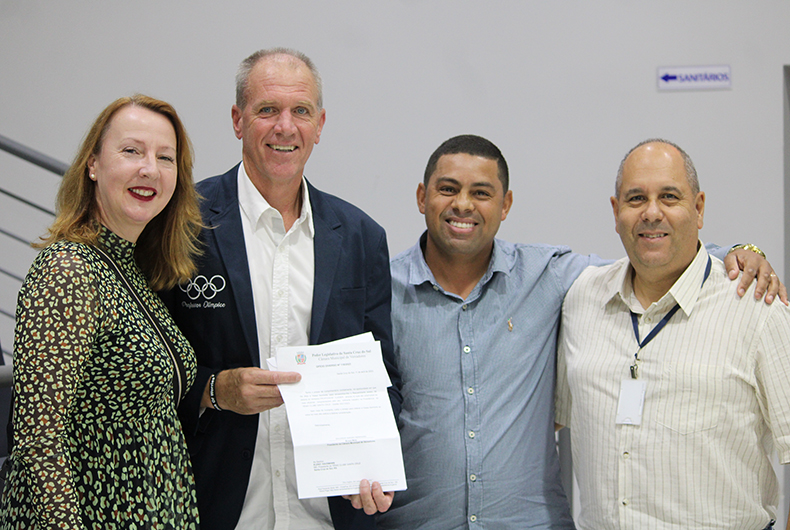 A sessão legislativa da Câmara de Vereadores dessa segunda-feira, 17, aprovou o projeto do vereador professor Cleber (União Brasil) que homenageia o Professor Olímpico Eleno Hausmann. Eleno se despede da presidência do Tênis Clube.