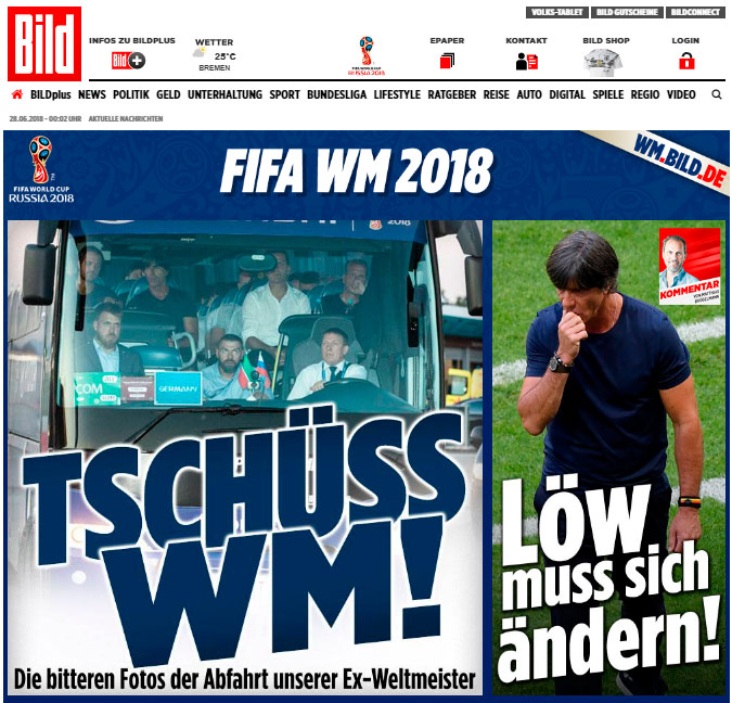 A Alemanha foi derrotada pela Coreia do Sul por 2 a 0 nesta quarta-feira, 27, na Kazan Arena, e foi eliminada da Copa do Mundo 2018 ainda na primeira fase. A inesperada tragédia se transformou em destaque na imprensa alemã, que buscava entender o motivo da queda precoce. Para relembrar, a Alemanha é a atual campeã do mundo e esteve nas últimas quatro semifinais.