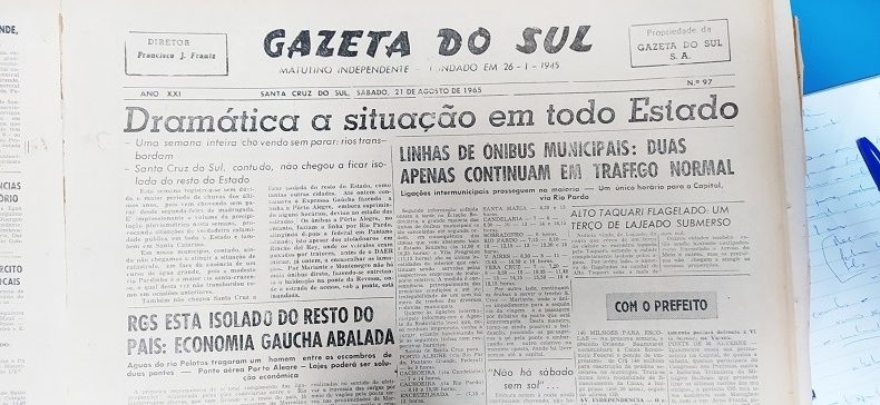 A Gazeta do Sul do dia 21 de agosto de 1965 dava o tom histórico dos problemas: “Uma semana inteira chovendo sem parar: rios transbordam”, informou; “Santa Cruz do Sul, contudo, não chegou a ficar isolada do resto do Estado”, assinalou. Ao contrário do Rio Grande do Sul, que, como frisava uma matéria de apoio, estava isolado do resto do País, e com a economia gaúcha muito abalada.