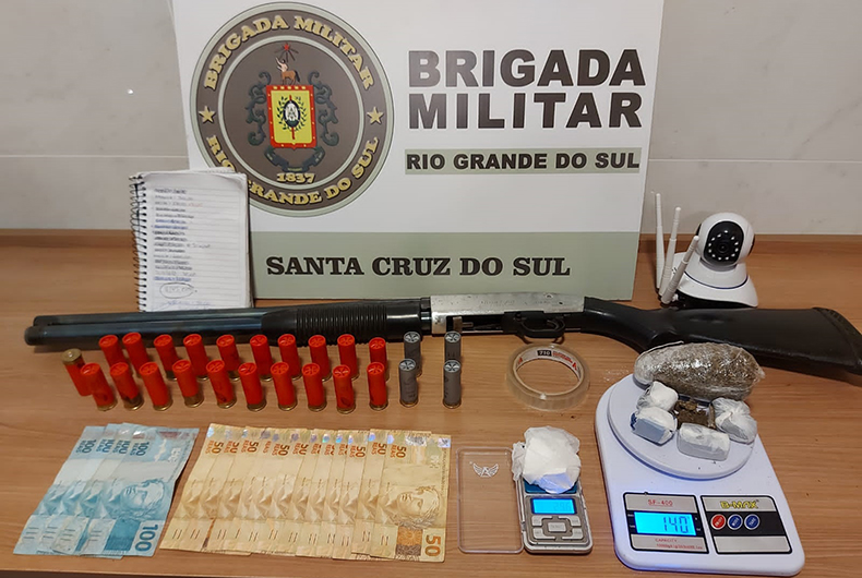 Segundo os policiais, o acusado foi flagrado comercializando drogas em um conhecido ponto de tráfico. Na abordagem, o homem tentou fugir até a residência onde mora e acabou preso dentro do imóvel. No local os policiais apreenderam porções de cocaína e maconha, ambas prontas para a venda, R$ 1 mil em dinheiro, uma espingarda de origem estrangeira calibre 12, munições do mesmo calibre, duas balanças de precisão, uma câmera de vigilância, anotações do tráfico e um aparelho celular.