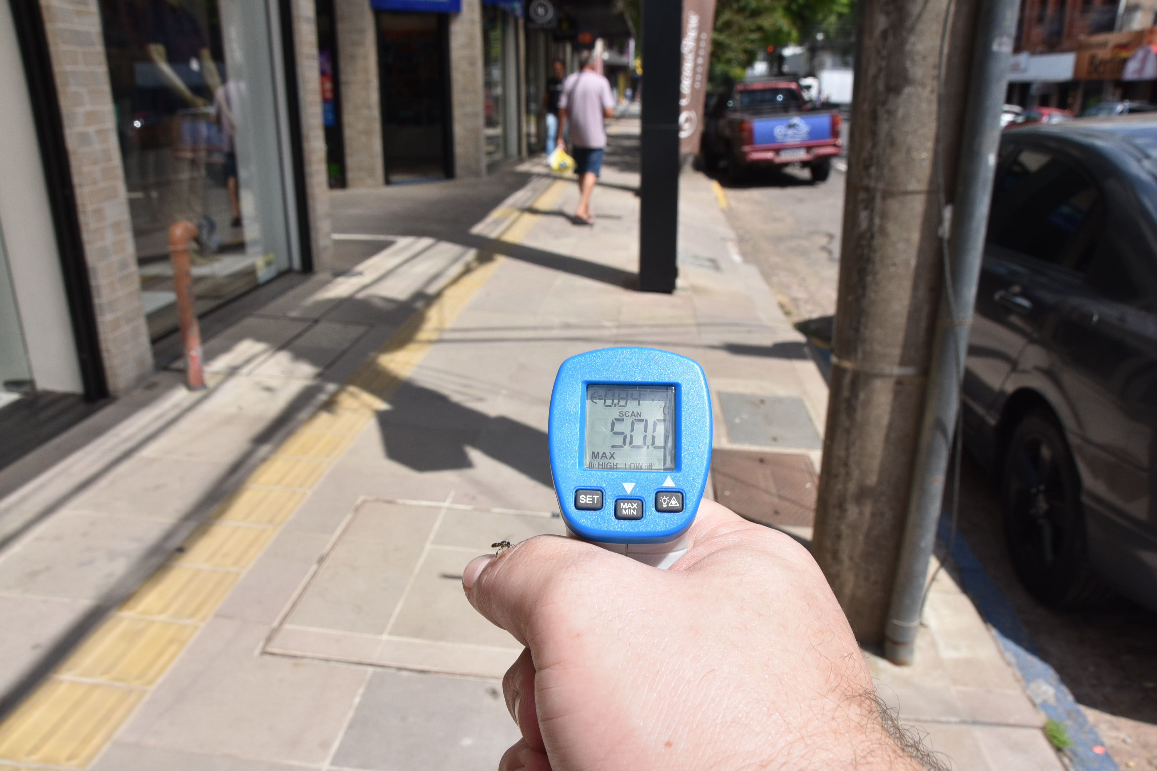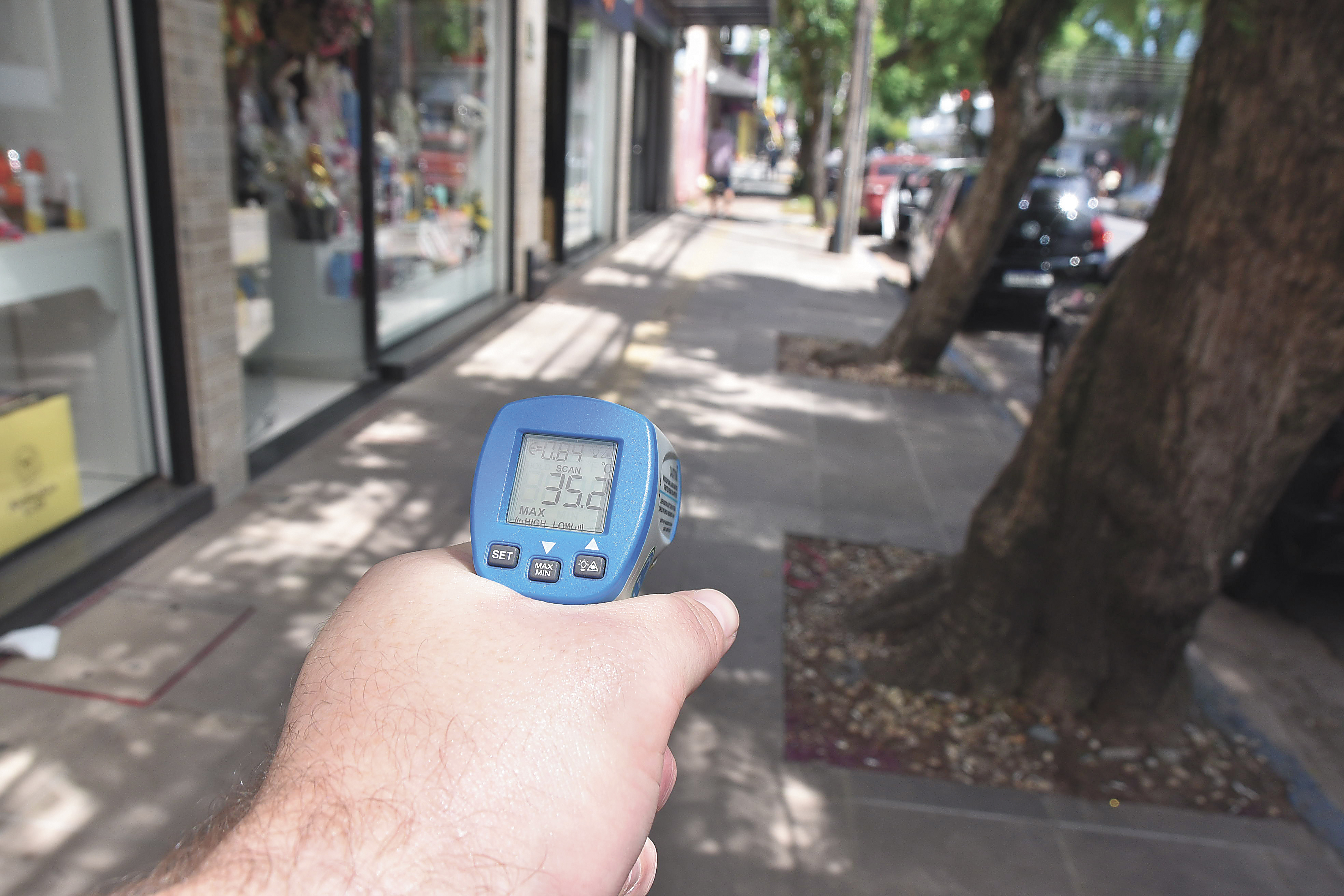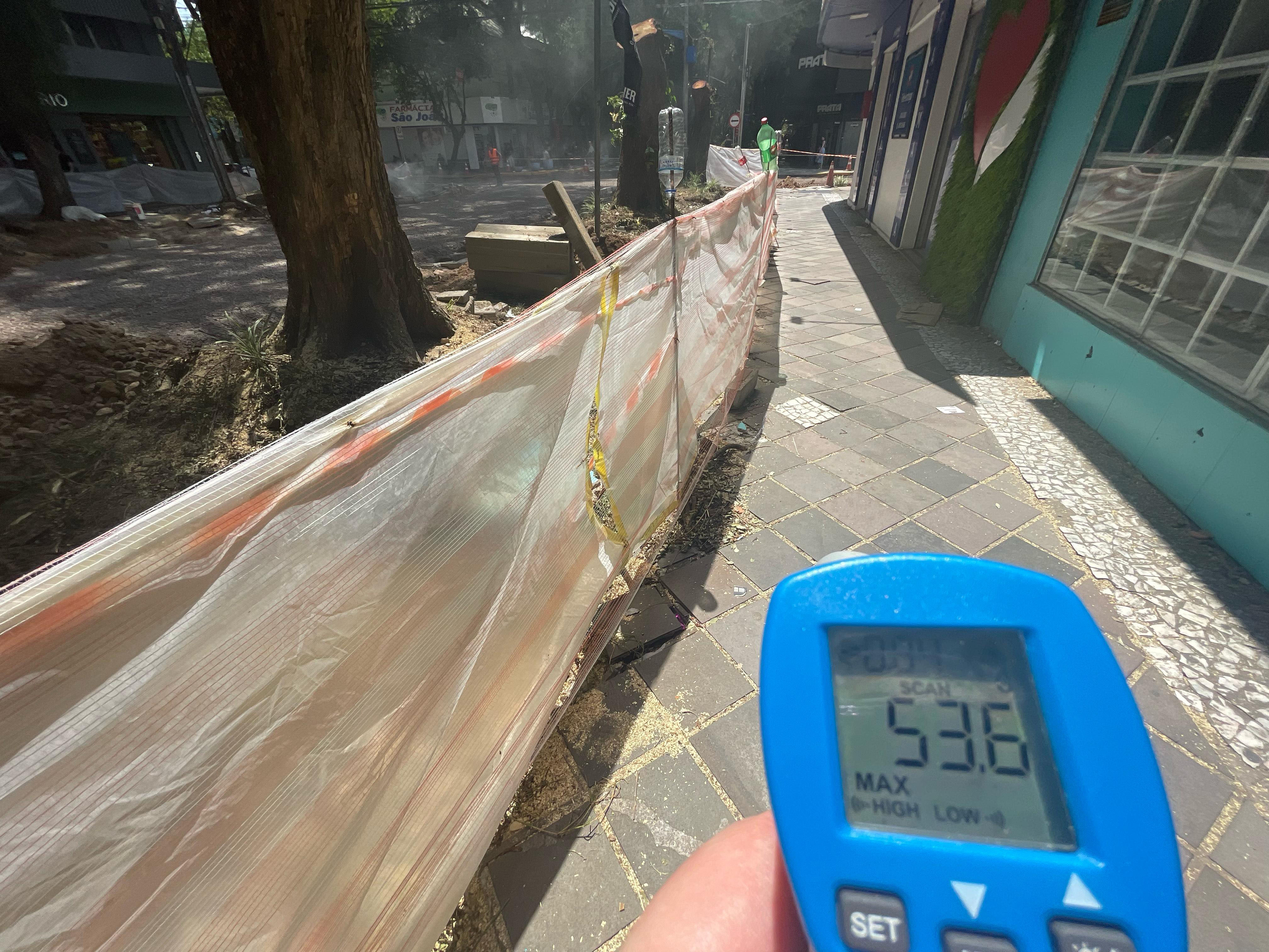 Na última terça-feira, em meio às altas temperaturas, às 13h30, a Gazeta do Sul visitou o Centro da cidade. E, com um termômetro, foi possível conferir o impacto provocado pela ausência da sombra gerada pelas quatro tipuanas.