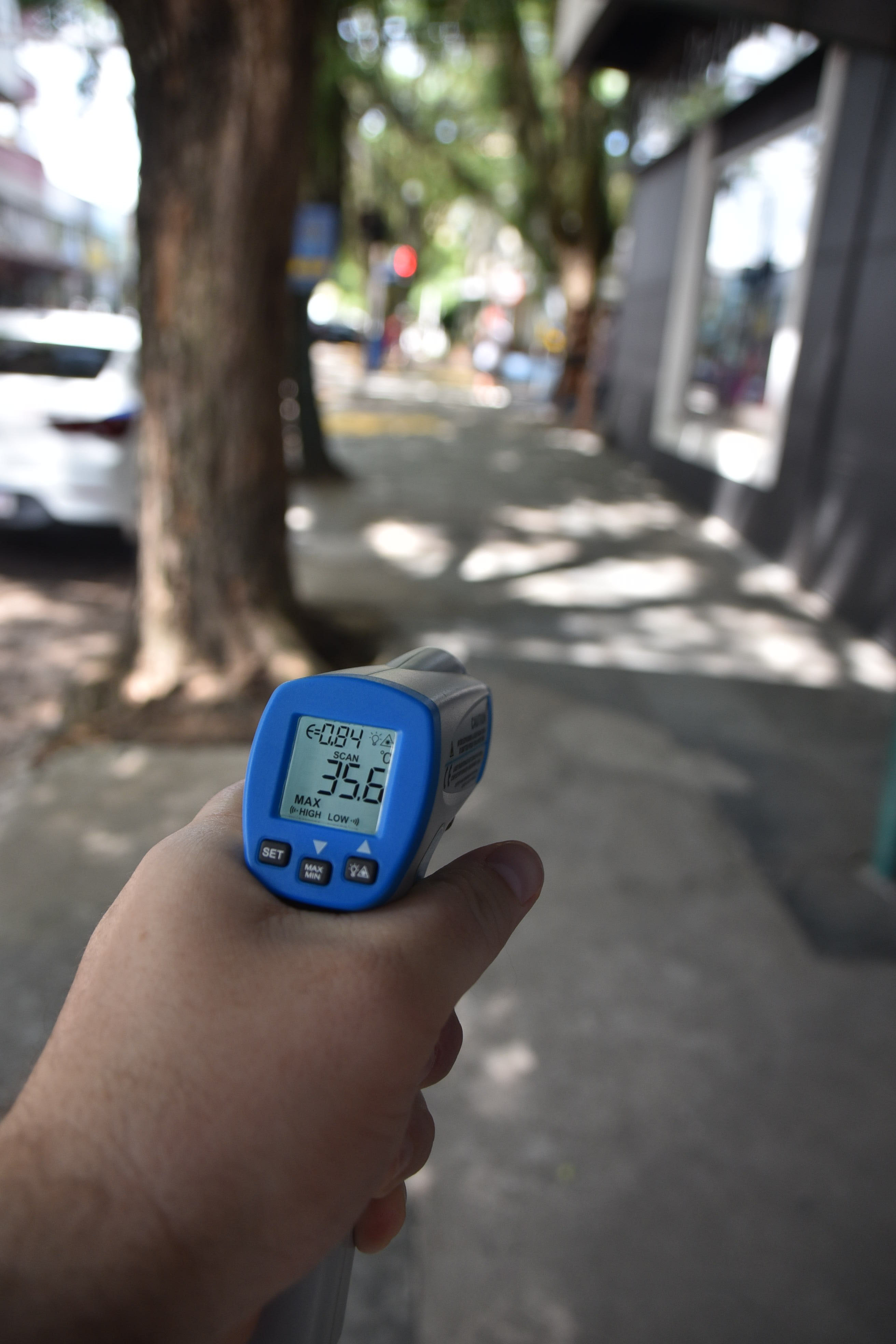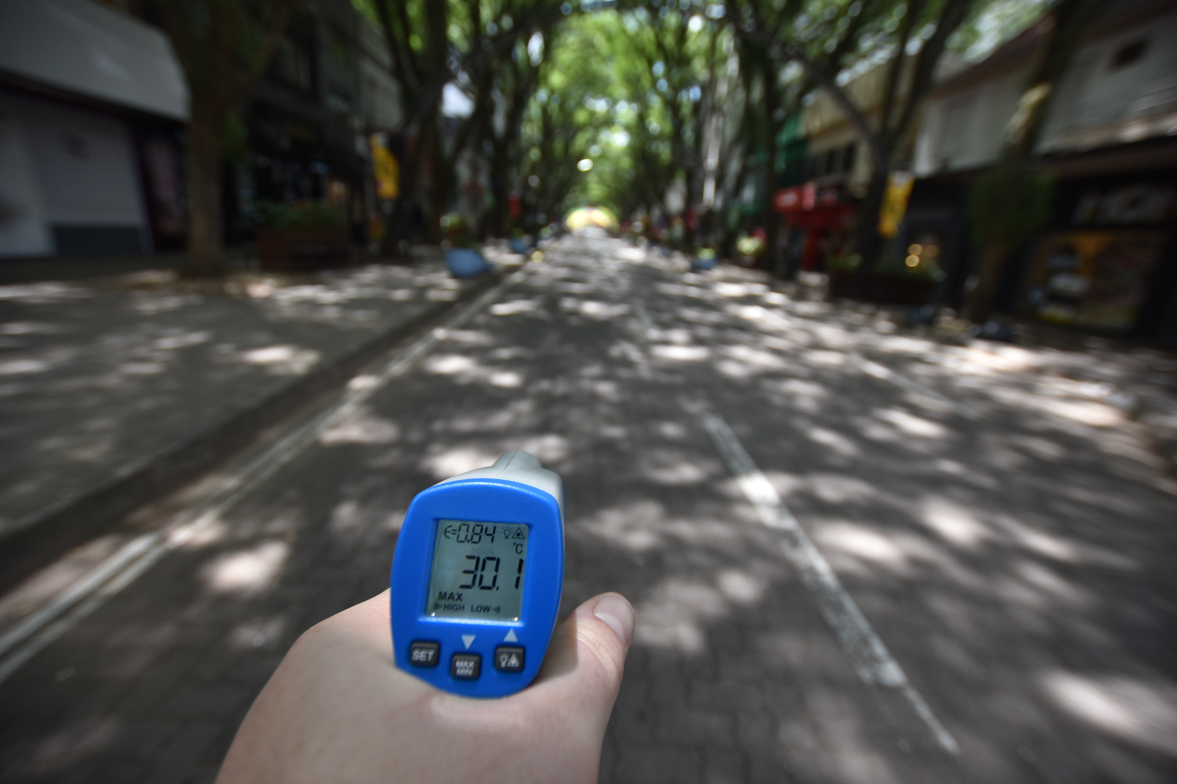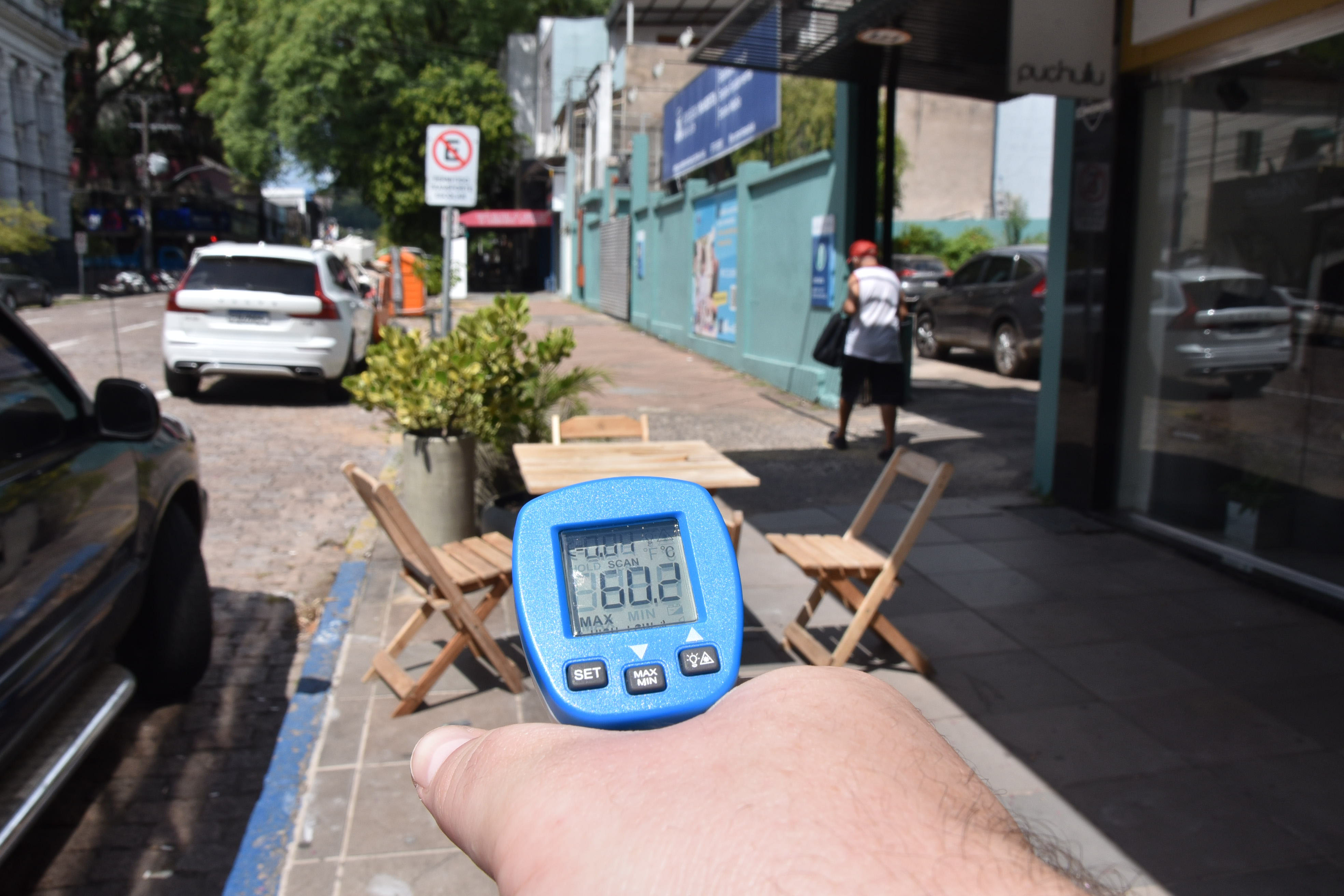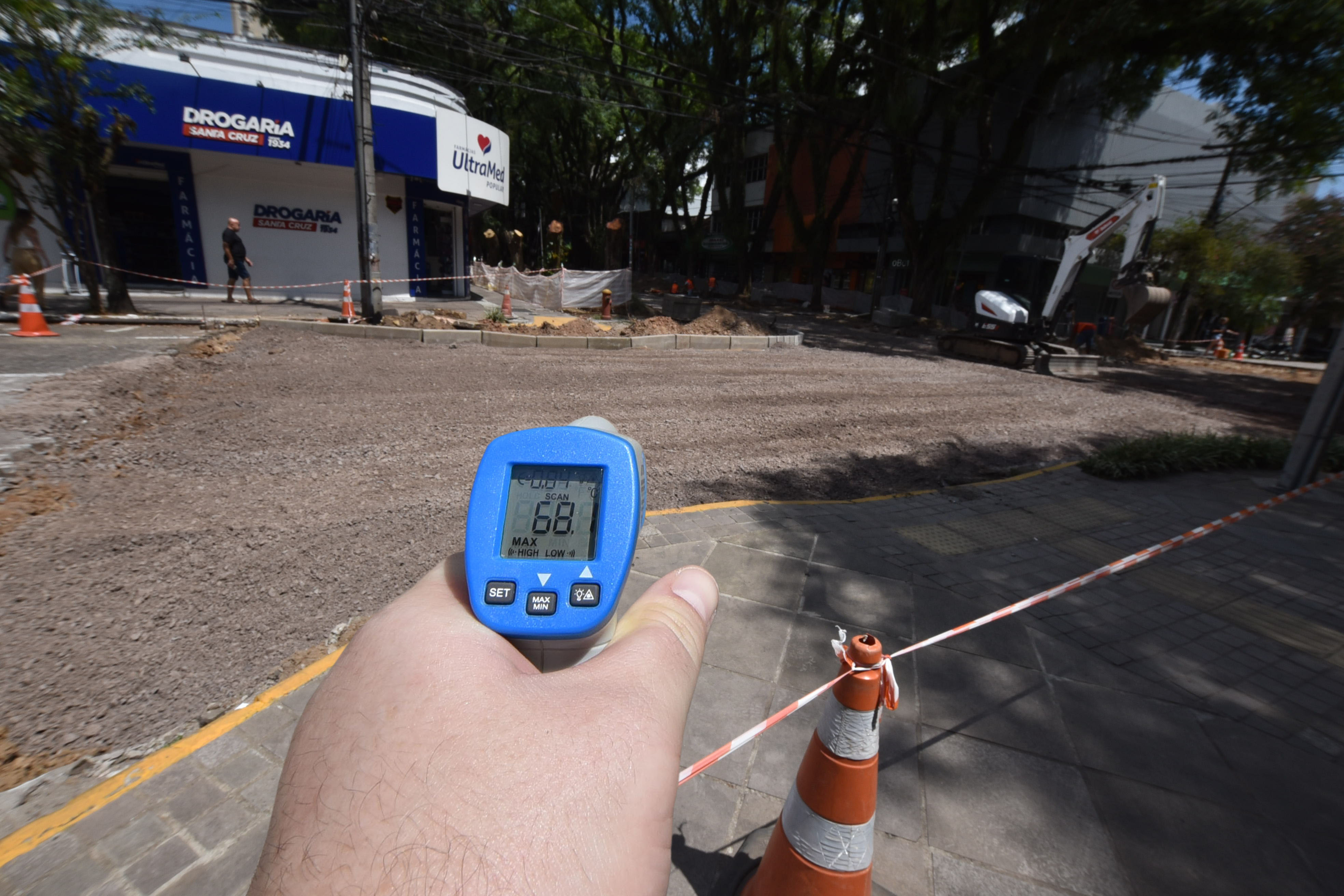 Na última terça-feira, em meio às altas temperaturas, às 13h30, a Gazeta do Sul visitou o Centro da cidade. E, com um termômetro, foi possível conferir o impacto provocado pela ausência da sombra gerada pelas quatro tipuanas.