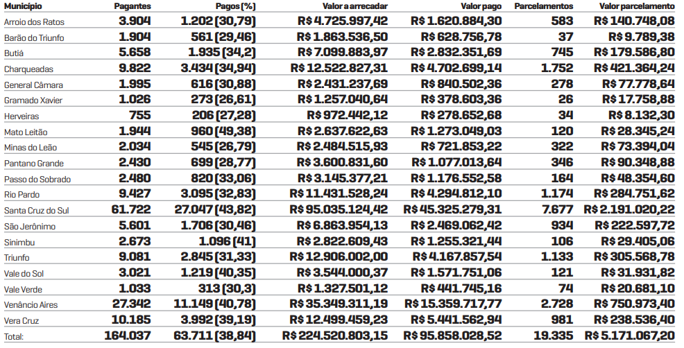 Juntos, estes pagaram R$ 2.191.020,22 somente referente à primeira parcela. Na região da 7ª Delegacia da Receita Estadual, mais de 19 mil proprietários de automóveis recorreram ao parcelamento. Em Santa Cruz, R$ 95.035.124,42 são devidos de IPVA em 2026. Desse total, já foram arrecadados pelo Estado e município R$ 45.325.279,31.