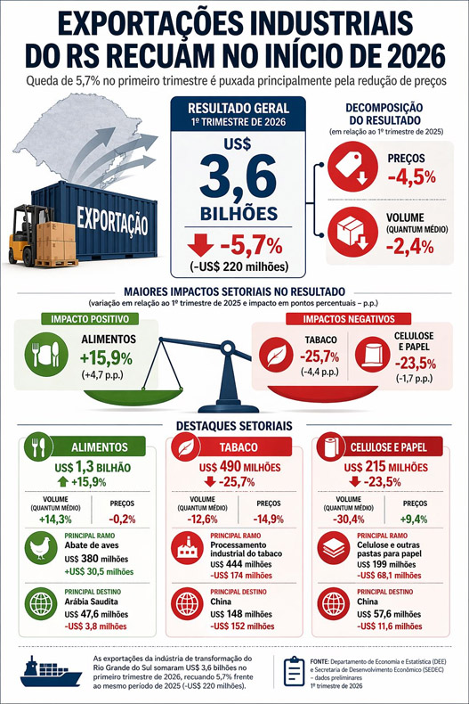 LEIA MAIS: Exportações da indústria gaúcha caem 5,7% no primeiro trimestre de 2026