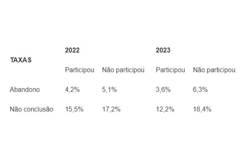 Os números também mostram que em 2022 os não participantes do TJE tiveram 14% mais chances de abandonar os estudos do que os participantes do programa. Essas chances de abandono aumentaram para 62% entre os que ficaram de fora. Além da não participação do TJE, outros fatores são associados à evasão, como idade superior, ser do gênero masculino, raça/cor não branca e alunos residentes de zona urbana.