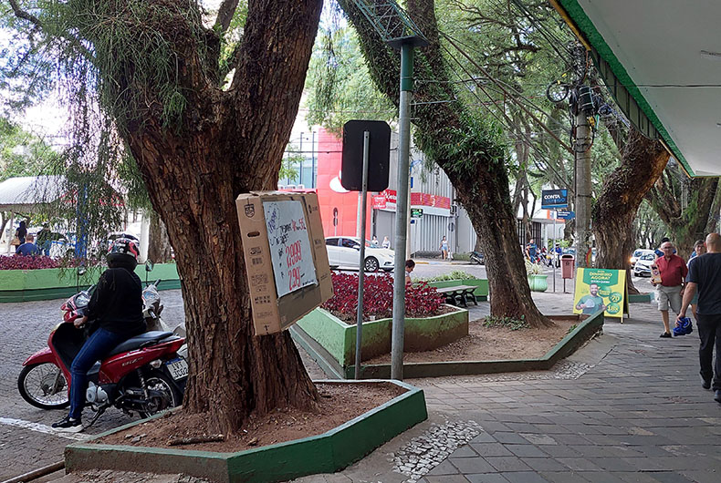 Uma embalagem de TV foi pendurada em uma tipuana, com os preços. Se a moda pega, em pouco tempo a beleza do Túnel Verde vai ficar ofuscada pela poluição visual. O mais indicado é que os lojistas ajudem a cuidar das árvores para que com o belo cartão-postal siga por muitos anos ainda.