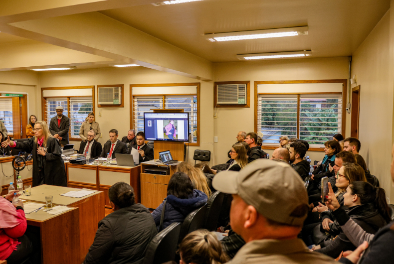 A sessão dessa segunda-feira começou às 9h30 e foi presidida pelo juiz Guilherme Roberto Jasper. Na bancada de defesa de Portella estava o advogado criminalista Daniel Tonetto, junto dos jovens Matheus Quartieri Simões Pires e Humberto Ramos Zweibrucker. Autora da denúncia, a promotora Maria Fernanda Cassol Moreira representou o MP, e os advogados Rafael Staub e Tatiana Borsa atuaram como assistentes de acusação na defesa da família Morsch-Santos.