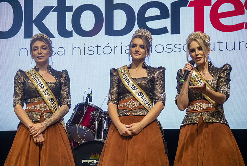 Em uma noite de grandes emoções, a maior delas foi a despedida do trio de soberanas, composto pela rainha Camila Eduarda Schaefer e as princesas Marília Fischer e Daniela Schoeninger. Com as vozes embargadas, as três discursaram e falaram sobre toda a dedicação que deixaram na 38ª Oktoberfest não somente durante a festa, mas também ao longo dos últimos meses, com a divulgação em outros municípios e participações em diversos outros eventos.