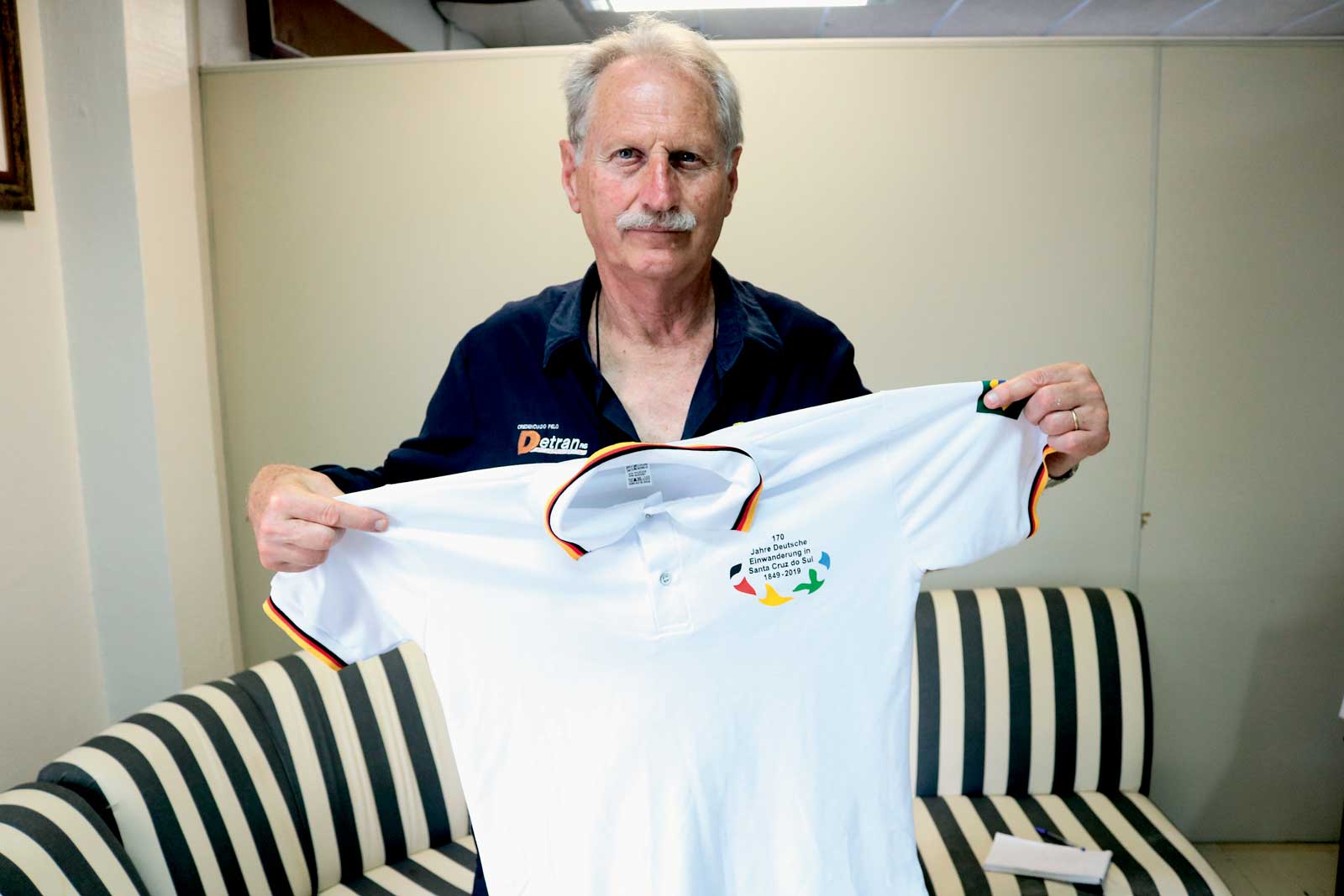Paulo Trinks e a camiseta oficial das comemorações dos 170 anos da imigração alemã