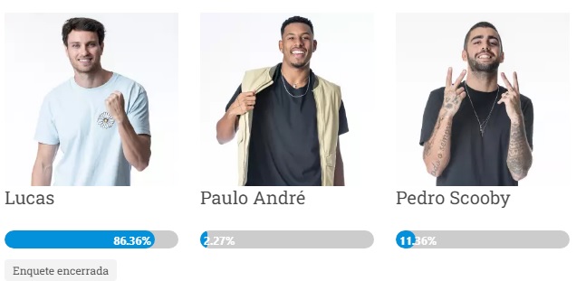Nesta terça-feira, 29, o público do Big Brother Brasil 22 vai conhecer mais um eliminado – e também o “Top 10” desta edição. Quem conta com a boa vontade dos espectadores para continuar na casa mais vigiada do Brasil é Lucas, Paulo André e Pedro Scooby. E, conforme a enquete feita pelo Portal Gaz, Lucas é quem deixará o reality, com 86,36% dos votos.