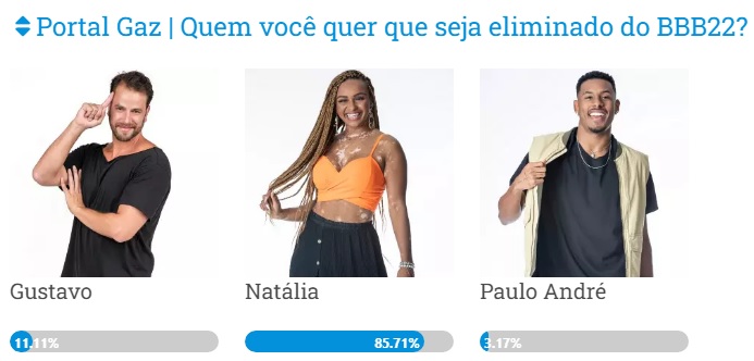 Em segundo lugar, e com bem menos chances de ser eliminado, está o bacharel em Direito Gustavo. Na enquete, ele registrou 11,11% das intenções de voto para ser excluído do reality. Por último, com chances quase nulas de deixar o programa, aparece o atleta olímpico Paulo André, somando apenas 3,17% dos votos.